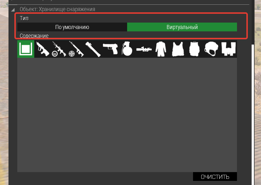 | Описание | Необходимо добавить к функционалу WOG 3den tools, функцию по изменению настроек хранилища снаряжения в технике и ящиках с "виртуальный" на "по умолчанию". | ||||