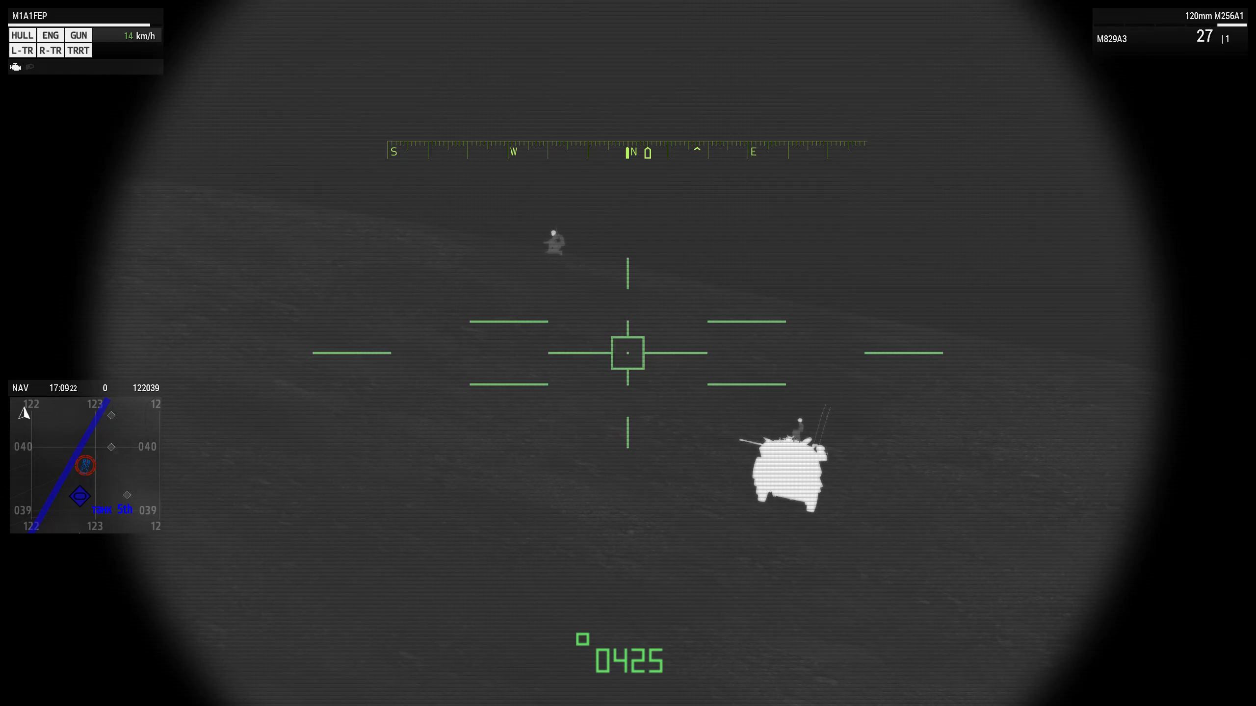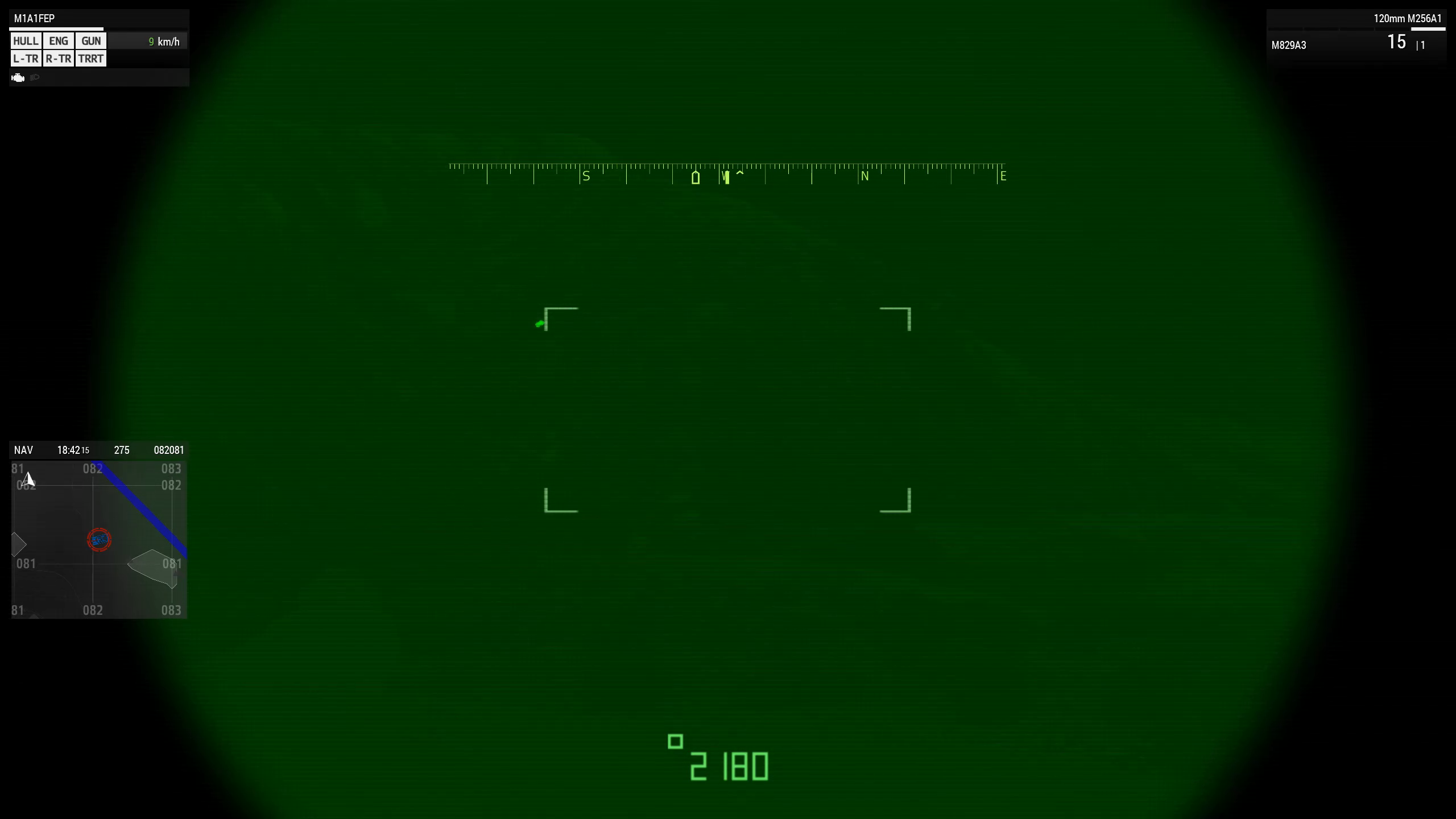 | Описание | Картинка, наблюдаемая в ТПВ-прицел Абрамса, по умолчанию преставлена преимущественно серой палитрой. Если в этом режиме переключиться на ПНВ, палитра меняется на зелёную. Переключиться обратно на серую не представляется возможным — нажатие на кнопку включения/отключения ПНВ ни к чему не приводит. | ||||