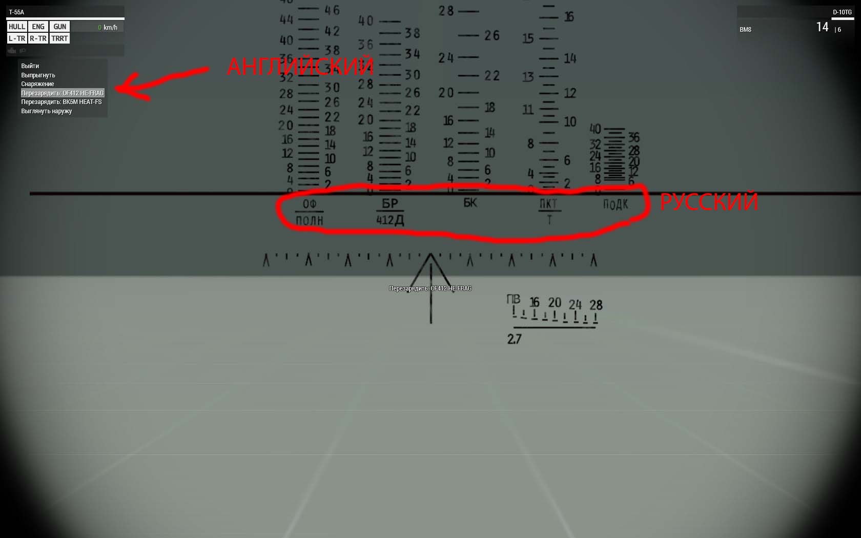 | Описание | В сетке прицела наводчика Т-55 названия снарядов на русском языке, а в меню на английском. | ||||