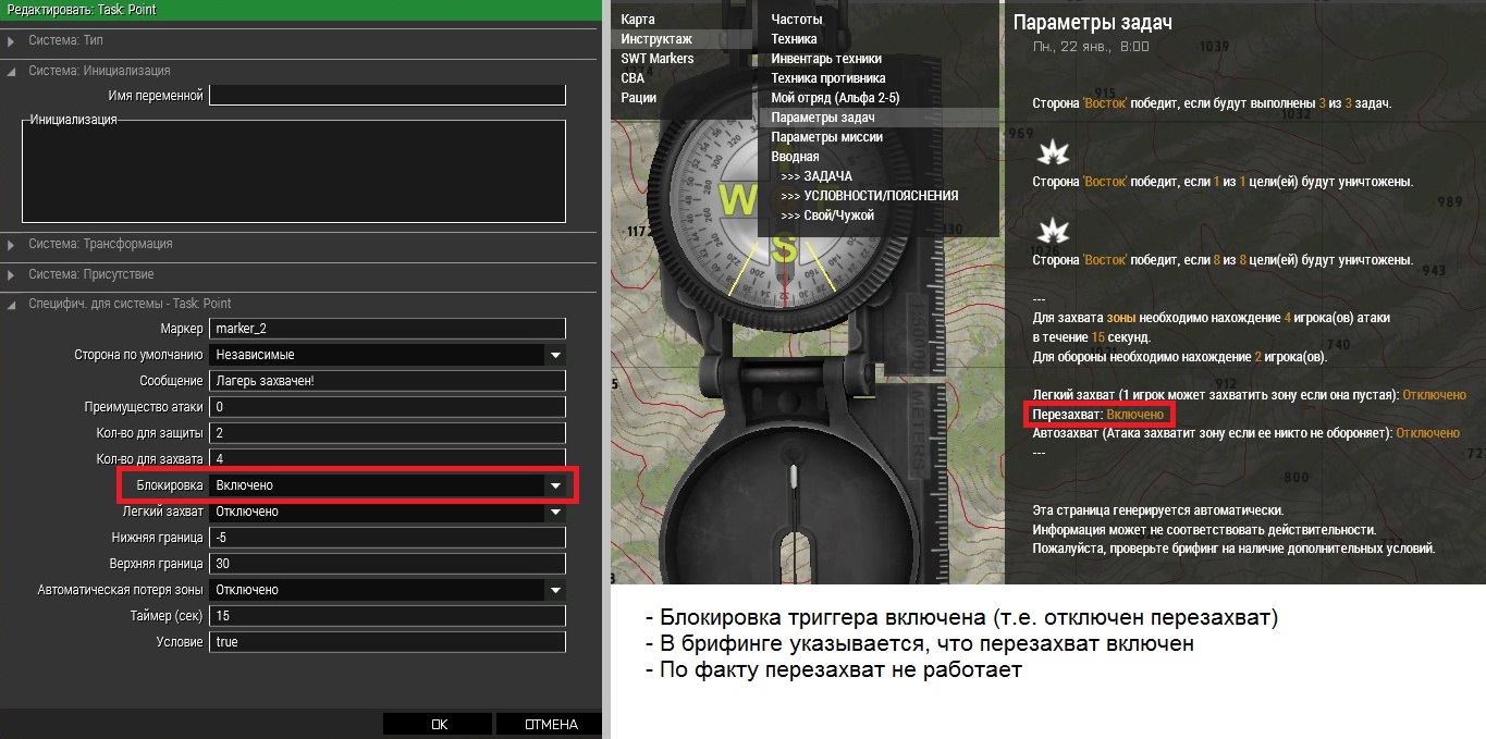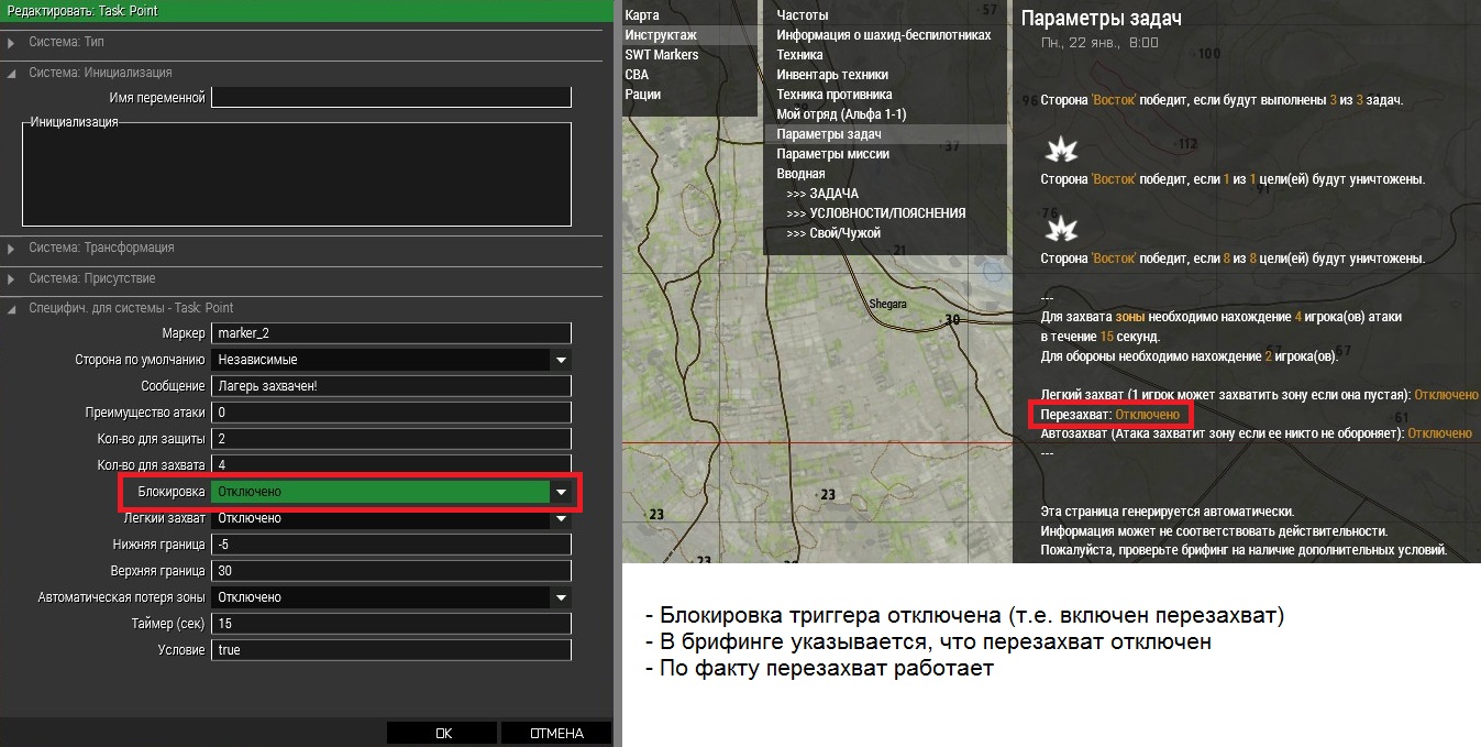 | Описание | Ошибка отображения в брифинге параметра перезахвата. В брифинге в графе "Параметры задач" неправильно указывается параметр перезахвата зоны. Пишет, что перезахват включен, когда он на самом деле выключен. И наоборот. Более наглядно в картинках. | ||||