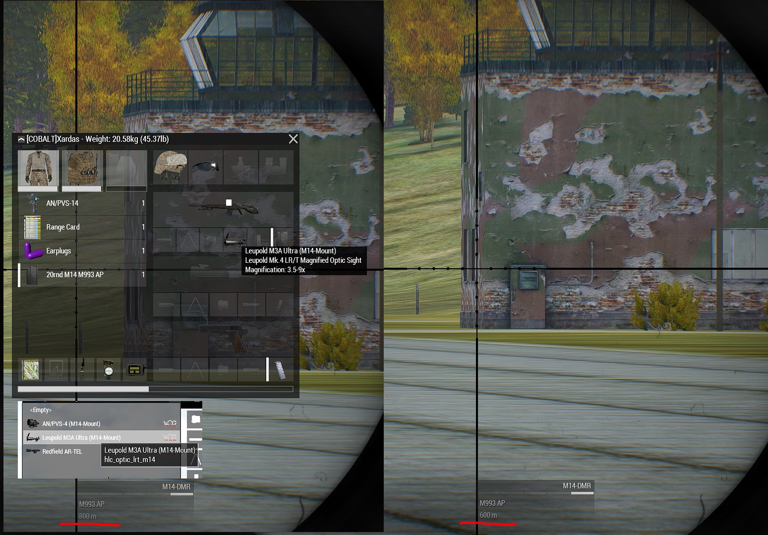 | Описание | У прицела hlc_optic_lrt_m14 можно менять зероинг по казуальному. То есть выставлять дальность стрельбы как у айронсайта: 100м 200м 300м 400м ... 1000м, а не как у оптики: 1 2 3 4 ...10 кликов. | ||||